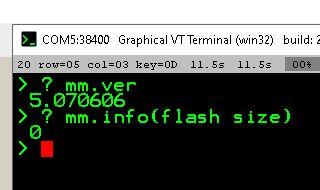 Thanks for the answer. mm.info(flash) makes sense... I don't use the slots, but mm.info(flash size) should return the amount of flash space available but it doesn't . So as you discovered also we found a bug?I did save a program in flash slot 1 and reloaded it from that slot, but mm.info(flash) does also return 0. Probably something not quite well? Edited 2023-02-13 16:58 by nbrok Greetings, Nick de pe1goo |