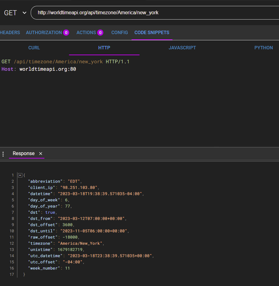 DIM GetRequest$ = "GET /api/timezone/America/new_york HTTP/1.1"+Chr$(13)+Chr$(10)+Chr$(13)+Chr$(10) Case may be important. new_york all in lower case. You need the 'HTTP/1.1" at the end and you seems to need two crlf pairs. Jim Edit: Case is NOT important for the location. Edited 2023-03-19 11:38 by TassyJim VK7JH MMedit |