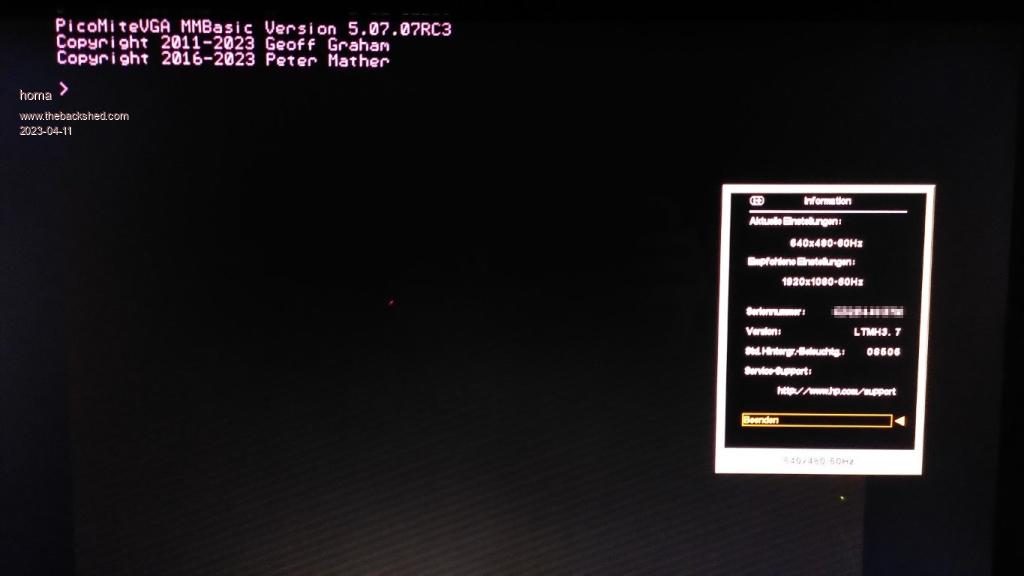 It may be worth testing the adapter on another monitor or TV. The output of the PicoMiteVGA does not match the default VGA settings on two monitors I have tried. The left hand side is cut off. Just required horizontal position adjustment on one but on the other moving the image to the right still left a missing strip on the left. Found a "Horizontal Phase" setting that fixed it. The issue appears to be the delay between the horizontal sync. pulse and the start of the line. I think the Pico adheres to the standard but not all monitors do. |