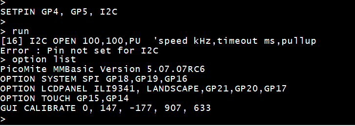 Your OPTION LIST doesn't show OPTION SYSTEM I2C sdapin, sclpin (This is a change from earliest times.) Try OPTION SYSTEM I2C GP4,GP5 (I think once you've used that, you don't need I2C OPEN.) ~ Edited 2023-04-25 22:45 by lizby PicoMite, Armmite F4, SensorKits, MMBasic Hardware, Games, etc. on fruitoftheshed |