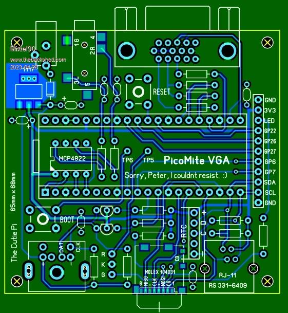 a) I haven't got one. b) The signals are all VGA no matter what connector you use. c) If you fit a DVI connector then someone will complain that it doesn't work (their TV/monitor doesn't support VGA on DVI pins, only digital - not the PicoMite's fault). d) You can use a VGA to DVI or VGA to HDMI adapter, of course. :) This is one of the problems with DVI. Unless you know the equipment you don't know what it supports. Not all devices support all the pins - even if they are present. A monitor with only a DVI connector may or may not support VGA, unless you have the manual you won't know until you try it. Nowadays it's probably more likely to only handle HDMI without audio. Mick Zilog Inside! nascom.info for Nascom & Gemini Preliminary MMBasic docs & my PCB designs |