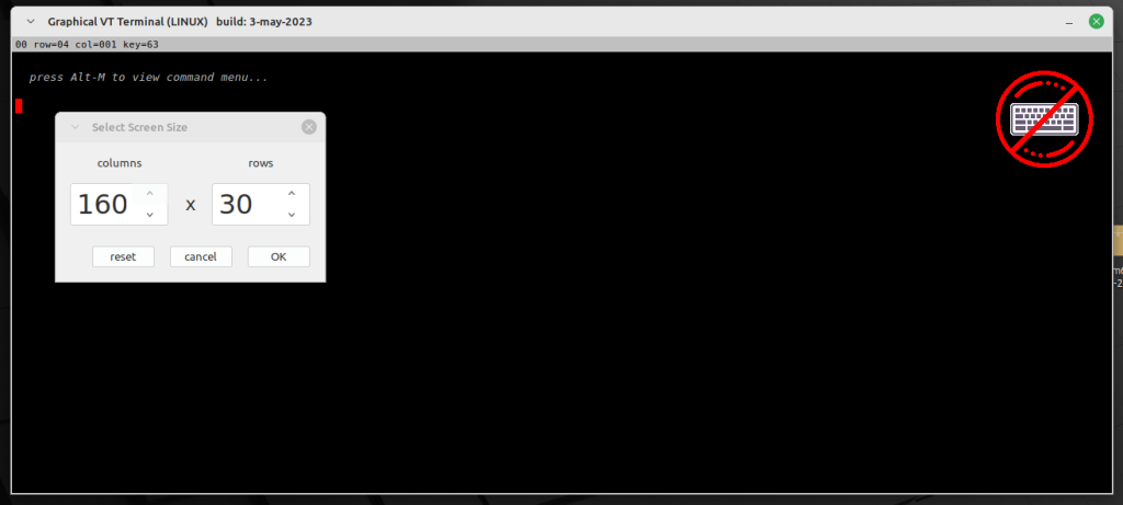 2. there is now a new menu option, "screen size" that enables you to manually set the screen size to anything between 40x16 and 160x60. this should accommodate the needs of the pico versions of MMbasic.