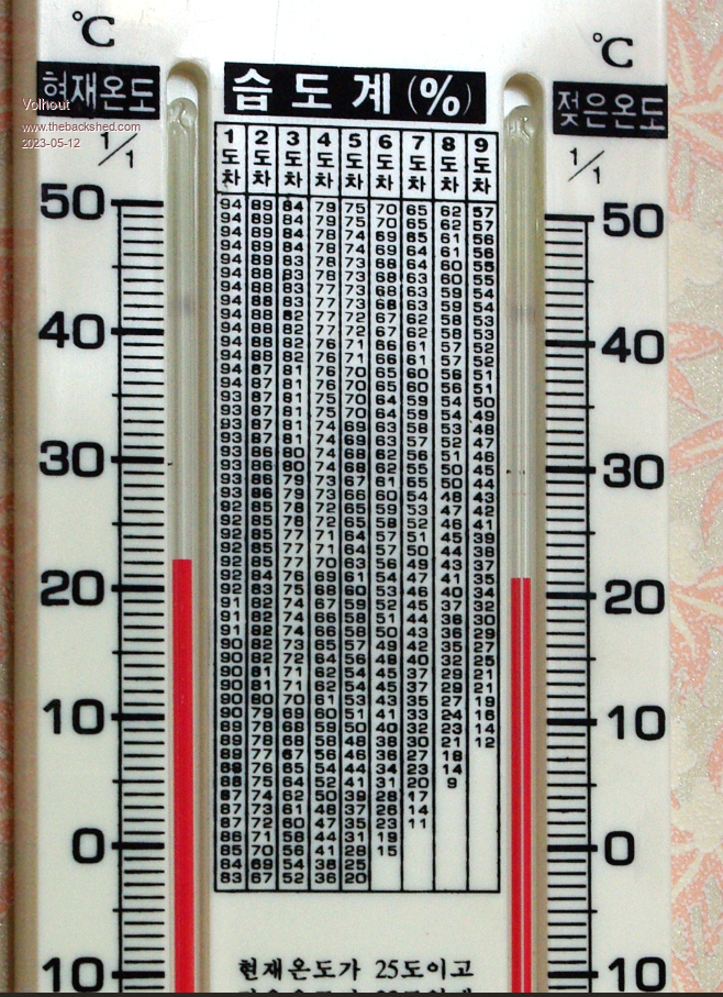 Looked at Wiki, found a picture that shows a physical device. My chineese is sub zero, but I think that the tables columns indicate the temperature difference and a certain level of the dry bulb (the wet bulb would normally not exceed 35C since humans would die, and there would be no-one to read the temperature).