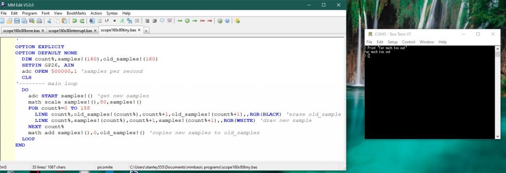 I reemphasise my view about mmedit. If I had to use the inbuilt editor I would not have bothered with mmbasic. sorry but mmedit is like gcbasic's ide so easy to adapt to. the teraterm terminal is er, retro? not the mmedit terminal. any road, how do you code a non vga rpipico board with inbuilt editor??