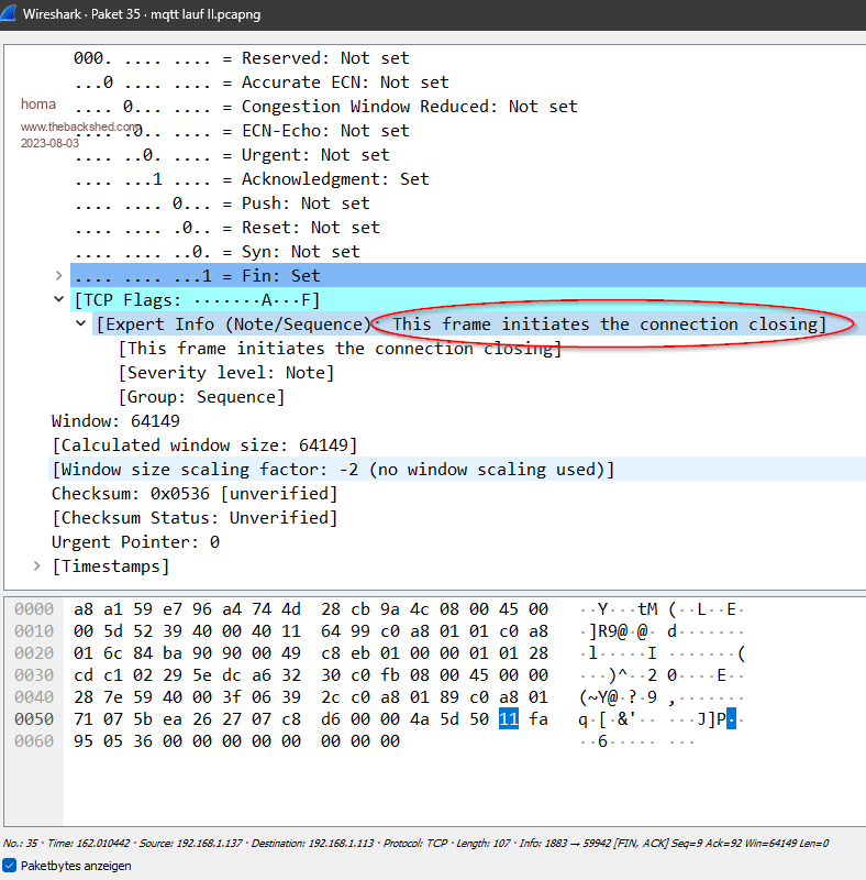 2 0.000000 192.168.1.113 192.168.1.137 TCP 101 [TCP Retransmission] 59941 → 1883 [FIN, ACK] Seq=1 Ack=1 Win=16376 Len=0