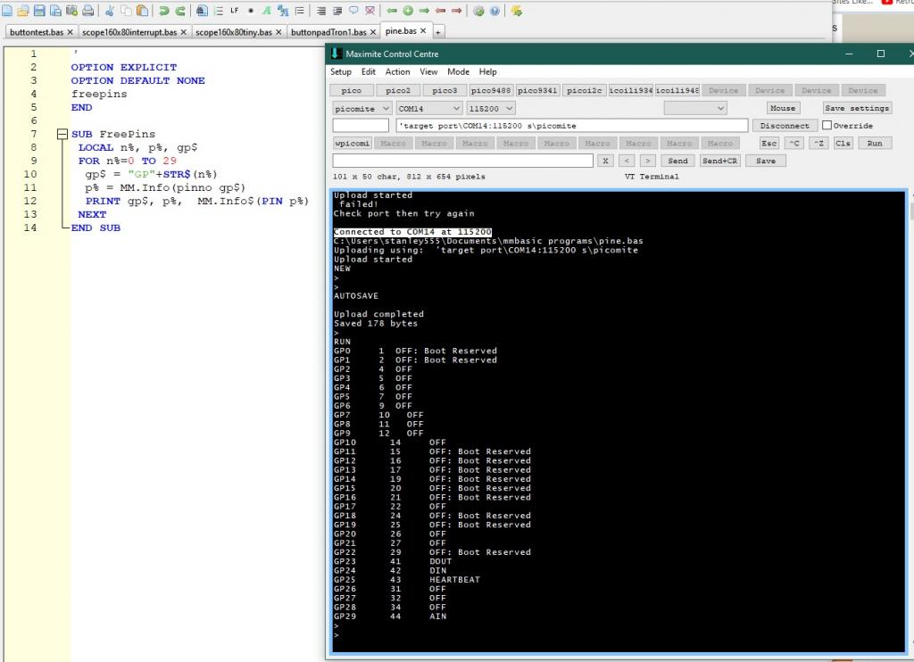OK, Mk2 Sub FreePins local n%, p%, gp$ For n%=0 To 29 gp$ = "GP"+Str$(n%) p% = MM.Info(pinno gp$) Print gp$, p%, MM.Info$(pin p%) Next End Sub |