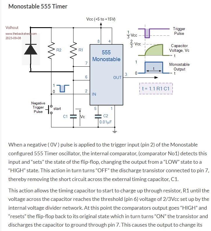 The monostable has a timeout of 1.1 x R x C.