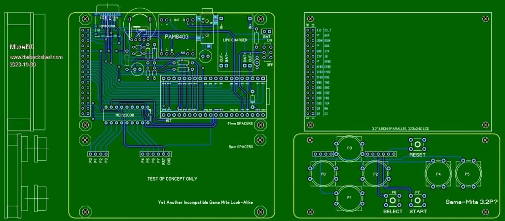 Peter commented that you couldn't sensibly get buttons below the 3.2" display using 100mm square PCB.so, being the awkward old goat that I am, I had to try it. :) I ended up having to lower them by 1.27mm. Apart from that (and moving the Reset button a bit) the buttons are in the same places as they are on Tom & Mick's design. I've cheated horribly because the PicoMite hasn't enough GPIO so the buttons are on an I2C expander. Consequently this isn't Game*Mite compatible and I can't make it so. It's merely a concept to see what would fit where. I've no display so I can't get an exact thickness or anything. Treat it as a pretty picture. :) Mick Zilog Inside! nascom.info for Nascom & Gemini Preliminary MMBasic docs & my PCB designs |