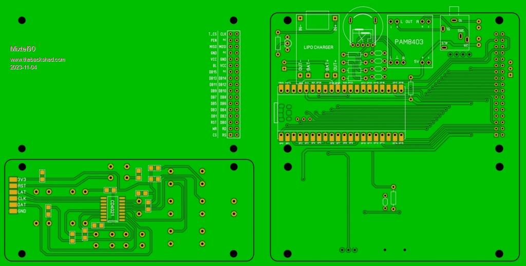 And now a big turnaround. Rearranged to do the following: Surface mount he Pico - no point in having 40 pins that have to be cropped down. This also reduces its height from the PCB surface. Put the components on the bottom of the PCB, using the space under the display for the battery and stereo speakers. Use a switched headphone jack socket. Move the (push-push) SD card socket and power switch to the front. Allow an option for the backlight to be dimmable. Mick Zilog Inside! nascom.info for Nascom & Gemini Preliminary MMBasic docs & my PCB designs |