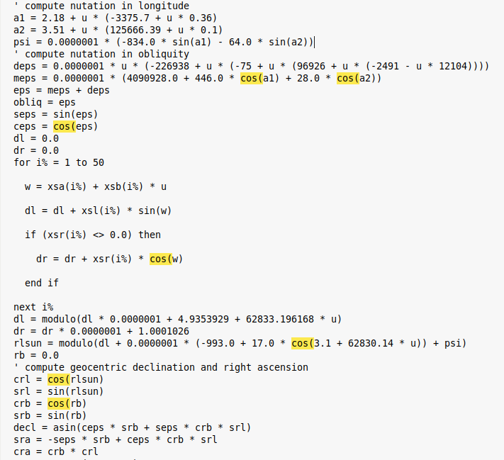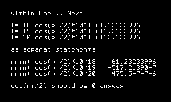 There is a funny result when calculating trigonometric functions using the cmm2. The results are not only not zero as expected but they differ when doing the calculation either within a for..next loop or step by step: print "within For .. Next" for i = 18 to 20 print "i=";i,"cos(pi/2)*10^i";cos(pi/2)*10^i next i print "as separat statements" print "print cos(pi/2)*10^18 =",cos(pi/2)*10^18 print "print cos(pi/2)*10^19 =",cos(pi/2)*10^19 print "print cos(pi/2)*10^20 =",cos(pi/2)*10^20 print "cos(pi/2) should be 0 anyway" ![]() -andreas .. and a happy new year! Edited 2024-01-01 02:31 by andreas |