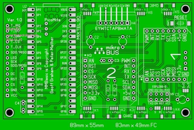 But suddenly I was inspired. :) Designed to fit a 3.2" ILI9341 with only a short distance between them. 5mm should be plenty. A PicoMite can be surface mounted too, which reduces the rear projection even more. As usual, there are options though. :) It can be built without a display. Seven QWIIC sockets can be fitted. One size 1 and one size 2 Click locations are available. There is a socket for a ESP8266-01S (replaces the Click 1 socket). An expansion port is available, but only GP28 is on it as standard. A YD-RP2040 can be used (plug-in only) in which case GPIO pins GP29 and GP23 are available and a RTC can be plugged into the expansion port. The Click sockets have been arranged to have their own SPI so that it doesn't cause problems with the display. Each one also allows INT to be used as a second PWM channel. There is a LM111& regulator that only feeds the display and all external connectors. The Pico switcher powers the PicoMite and a microSD card socket. DISPLAY Reset GP4 T_IRQ GP0 CS GP1 T_CS GP5 SD_CS GP13 SCK GP10 T_SCK SD_SCK SPI2 MOSI GP11 T_DIN SD_MOSI SPI2 MISO GP12 T_DO SD_MISO SPI2 DC GP7 LED GP6 OPTION SYSTEM SPI GP10, GP11, GP12 OPTION LCDPANEL ILI9341, L, GP7, GP4, GP1, GP6 OPTION TOUCH GP5, GP0 OPTION SDCARD GP13 IF YD-RP2040 IS FITTED OPTION PICO OFF OPTION SYSTEM I2C GP28, GP29 'I2C OPTION RTC AUTOENABLE 'IF RTC IS PLUGGED INTO K9 CLICK COMMON Reset RUN SCK GP18 SPI MOSI GP19 SPI MISO GP20 SPI TX GP16 COM1 RX GP17 COM1 SDA GP2 I2C2 SCL GP3 I2C2 CLICK 1 CLICK2 CS GP21 CS GP22 AN GP27 ADC1 AN GP26 ADC0 PWM GP8 PWM4A PWM GP14 PWM7A INT GP9 PWM4B INT GP15 PWM7B QWIIC SOCKETS SDA GP2 I2C2 SCL GP3 I2C2 EXPANSION PORT IF YD-RP2040 IS FITTED IF STANDARD PICO IS FITTED 1 GND GND 2 GP23 (nc for RTC) 3V3EN 3 GP29 I2C_SCL ADC VREF 4 GP28 I2C_SDA GP28 5 3V3 3V23 6 RUN RUN TINY RTC CAN ONLY BE FITTED WITH YD-RP2040 Edited 2024-01-15 03:52 by Mixtel90 Mick Zilog Inside! nascom.info for Nascom & Gemini Preliminary MMBasic docs & my PCB designs |