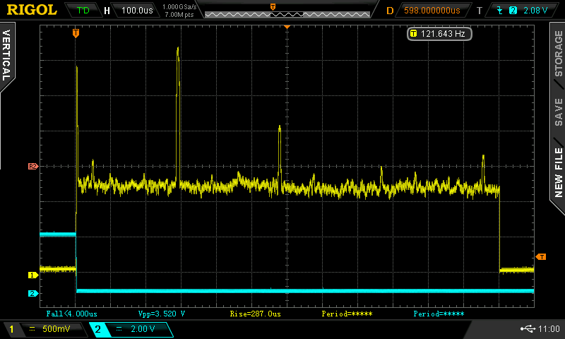 Yellow is the FFT magnitude. 0 to 250kHz over 12 divisions