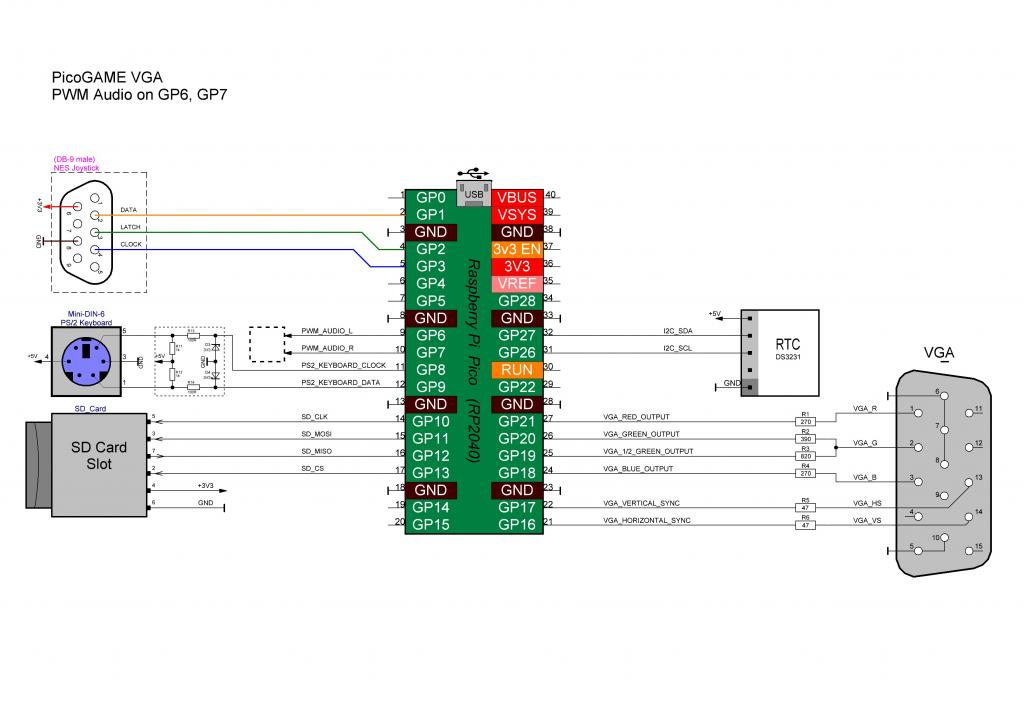 PicoGAME has GP0, GP1, GP2 and GP3 on Port A for the joystick/controller connections. Hi Mick, I did an assembly for PicoGAME VGA using a NES gamepad connected to Port A, which uses GPIO ports for its operation: GP1, GP2, GP3 PWM sound on ports GP6, GP7 If you or anyone else needs it, I can change the connection as you please. And, although the RTS is shown in this diagram, it is not used for the GameBoy emulator. Best regards to everyone, Java |