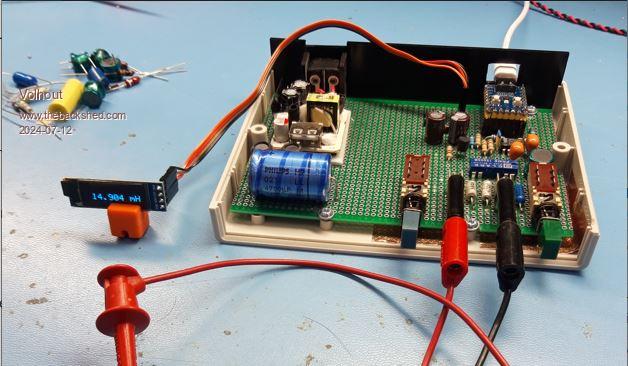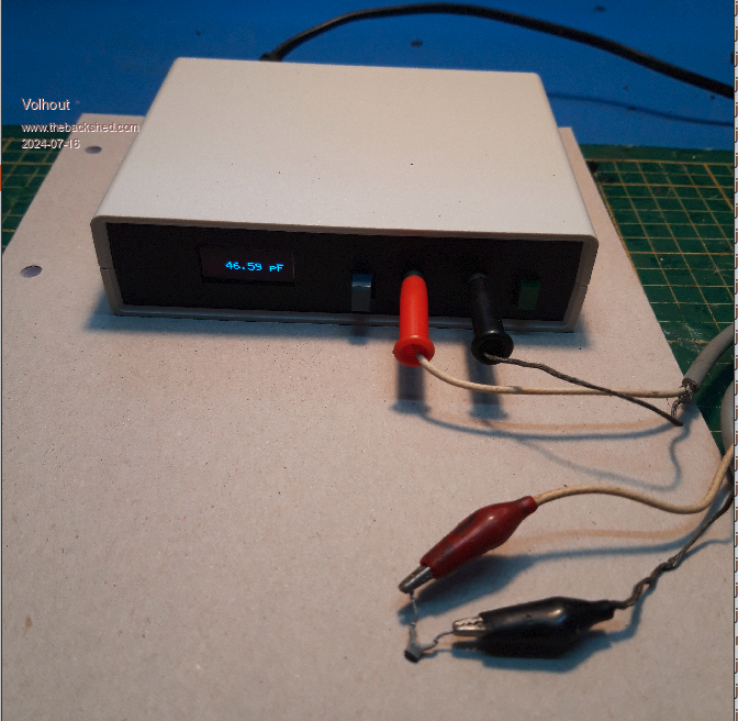 The unit in operation, measuring a 47pF ceramic capacitor, using a long coax cable with alligator clips, that is zero'ed out. Running from the 230V charger power suppy inside the box.