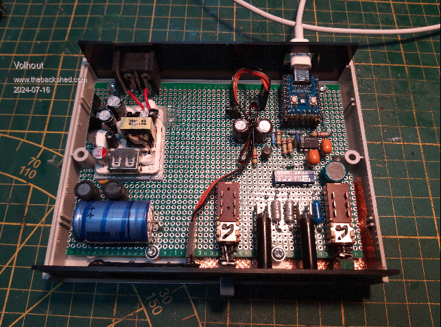 It is in a G738 box (same as the CMM2), and has a 4 euro phone charger as power supply. Since the charger outputs quite a lot of ripple, and old 4700uF cap came to the rescue. Not visible is the copper foil under the PCB, to shield the bottom from the outside world.