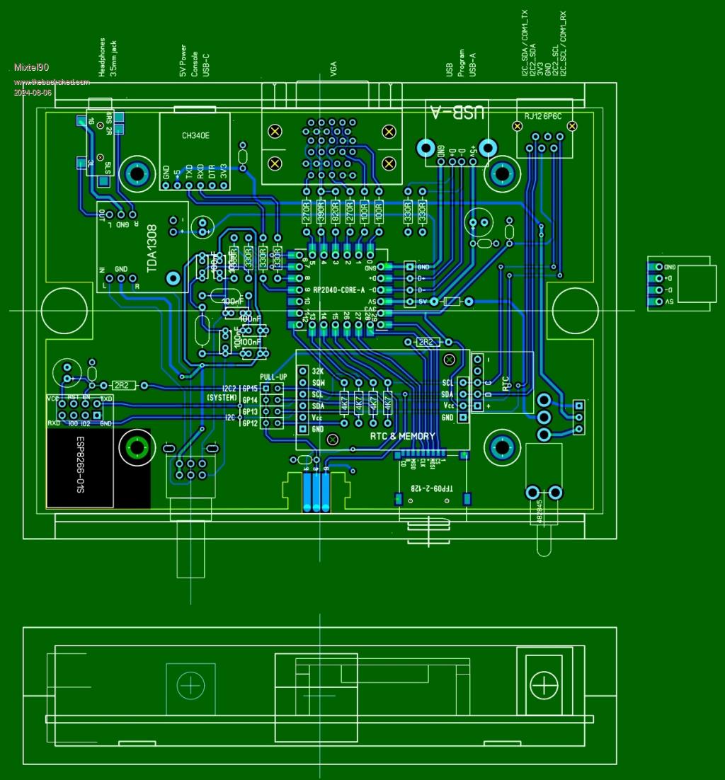 This uses the little Multicomp case (also sold as the Hammond RM2015S which has better availability and is often cheaper). It's mainly an exercise in using the RP2040-CORE-A module to see what I could do with it. The advantage here is that the USB socket can be USB-A, which is useful as it will take a keyboard directly. Unfortunately it's only available from AE, I think, and is relatively expensive for a RP2040 module.