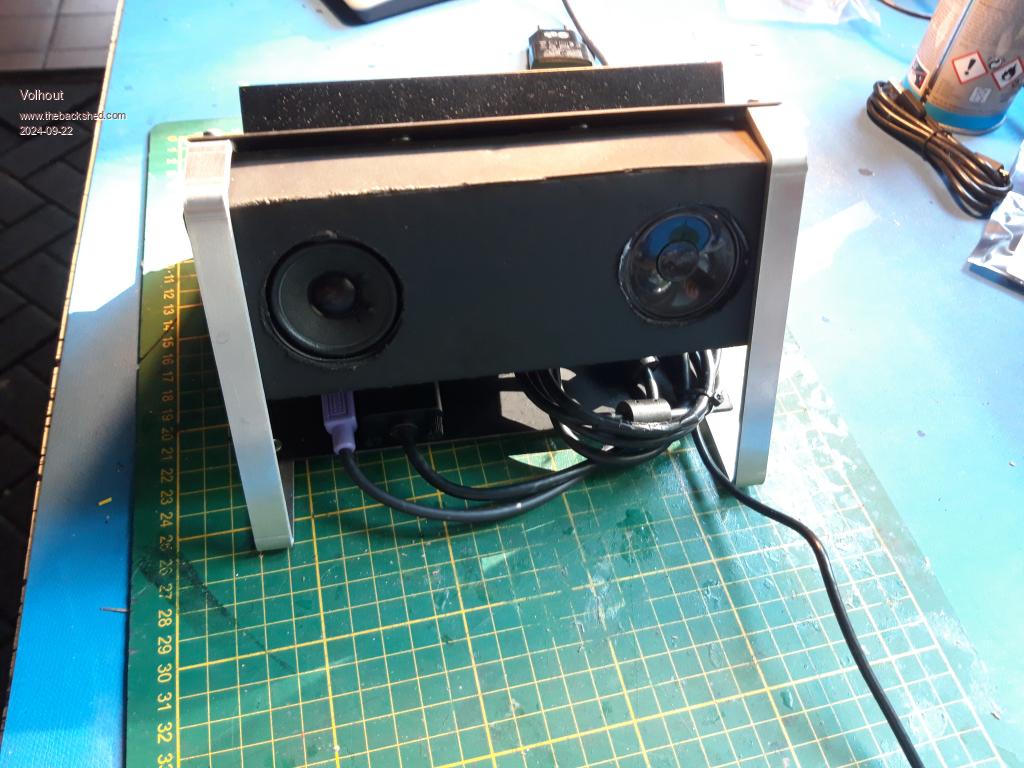 And audio amplifier, and 2 5cm speakers complete the rig. The speakers are different, but what the heck, they make sound....