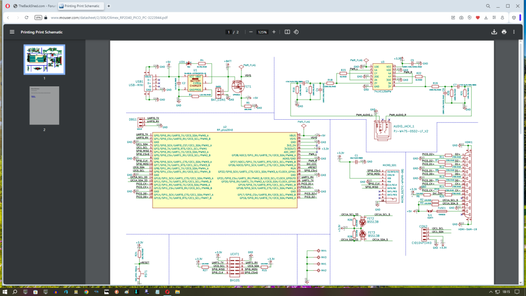 MMBasic's audio wants both channels to be on the same PWM, where they use A and B outputs. GP26 and GP27 would be fine for this as they ae on PWM5. The Olimex board has used GP28 (PWM6A) and GP27 (PWM5B) for audio and put GP28 on the DVI_CEC signal. This seems a weird choice. Why take the A channel from one PWM and the B channel from another? In fact, the whole of the audio side is odd. They took the PWM output, put it through a logic buffer then fed it into the simplest RC filter that was first used on the Micromite (except that they took the DC off the output). They put some resistors in to run an extra buffer too but then disabled it. Very strange and they don't seem to have gained anything. By linking GP26 to GP28 you are getting the right channel from GP27, the left channel will appear on GP26 which is then linked to GP28 so that it can appear as audio. The audio connections for the RP2350 and the RP2040 are identical when running MMBasic. . Edited 2024-11-18 05:59 by Mixtel90 Mick Zilog Inside! nascom.info for Nascom & Gemini Preliminary MMBasic docs & my PCB designs |