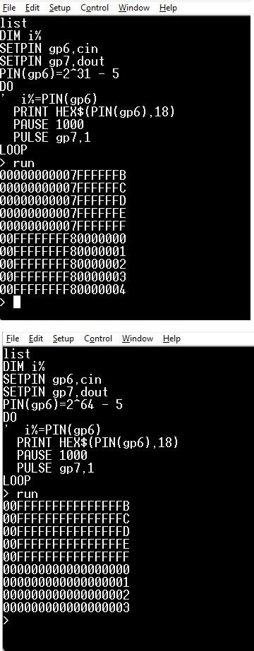 Try signed 32 bit so 2147483647 ' OPTION DEFAULT INTEGER DIM i,k SETPIN GP6, CIN SETPIN GP7, DOUT PIN(GP6) = 2^31 - 10 PRINT PIN(GP6) DO i = PIN(GP6) PULSE GP7, 1 PRINT i INC k LOOP UNTIL k >20 VK7JH MMedit |