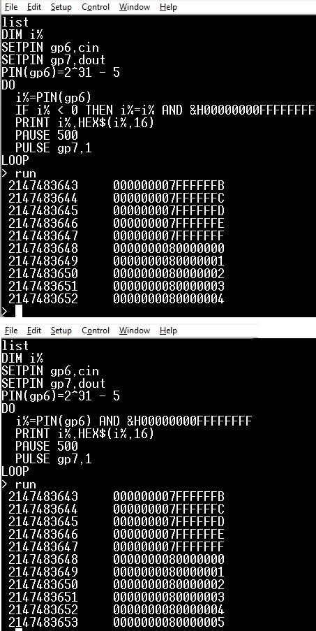 Interesting, so if you need more than 31 bits:- > setpin gp6,cin > pin(gp6)= -(2^31) > setpin gp2,pwm > pwm 1,100000,50 > ? pin(gp6) -2145157319 > ? pin(gp6) -2144146087 > ? pin(gp6) -2139827601 > do:? pin(gp6):pause 100000:loop -2133966670 -2123966649 -2113966632 -2103966616 -2093966601 |