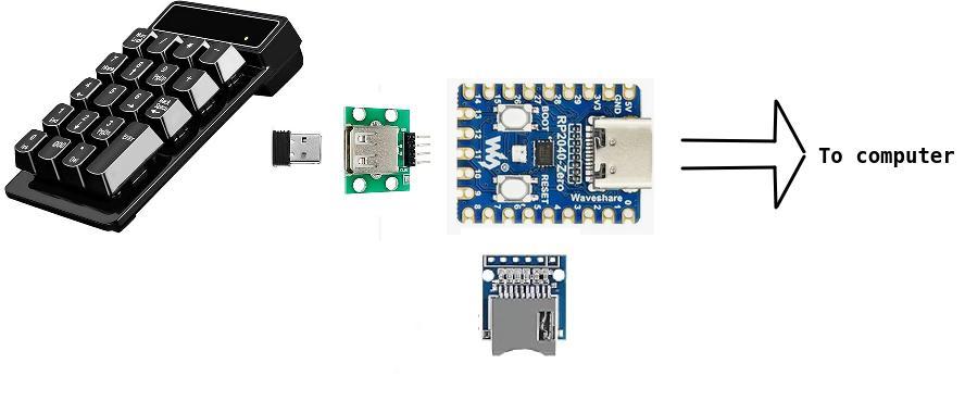 Volhout the USB wireless receiver comes with the keypad which has the transmitter built in. I guess no one is understanding what this is to do. I am using the keypad as my first test but the pico part would be able to have any keyboard plugged in and send the macro for the pressed key out to the computer. With a full keyboard one could map a lot of words and mouse functions being sent to the computer. Best part it should be OS independent Linux, Windows ?Mac. Would act as if someone typing or using mouse. There are very costly macro keyboards that do some of what I want this to do. Think of it like this I have my main keyboard plugged in if you plug in a 2nd they act the same. Press "A" on ether and get and "A". Using this idea your main still sends and "A" for the A key but the keyboard plugged into the device would send "Hello world. How are you?" as that is what remapped when the "A" is sent by the 2nd keyboard. The pico gets the keys from 2nd keyboard and looks up what to send from the SDcard. Hope this is a better description its function. Have FUN Quazee137 "this took some time to type one handed lots of fixing" |
