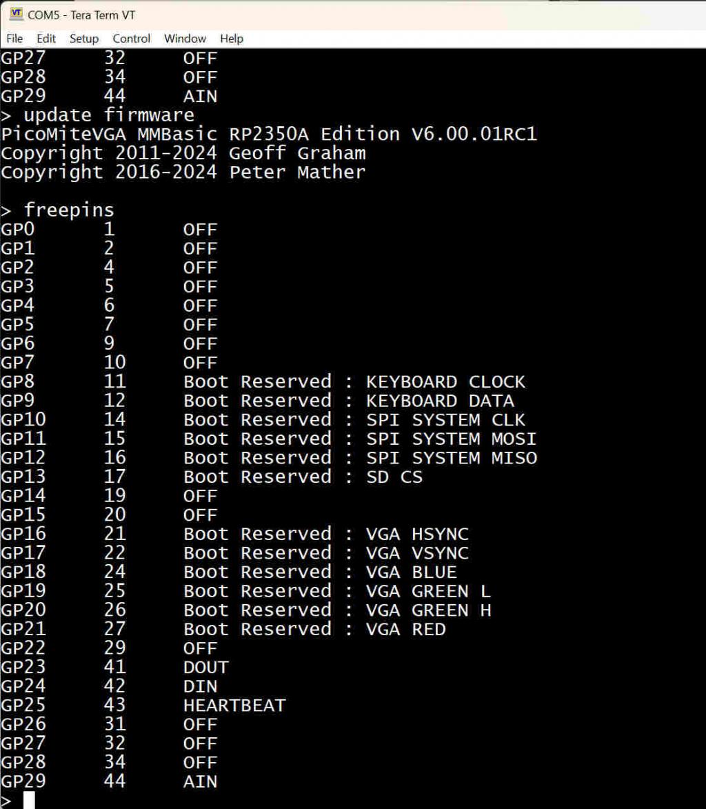 Raspberry Pi have just released an update to the sdk (2.1.0) which is used to build the PicoMite. I've changed to this because it is needed to support the Pico2-W which I will endeavour to support once I have one. It makes sense to do the upgrade now before the final V6.00.00 release. As a result I have increased the version number and rebuilt all the versions. There should be no changes other than DEVICE WII should now work as before (you can also use DEVICE WII, DEVICE WII CLASSIC or just "WII CLASSIC". PicoMiteRP2350V6.00.01RC1.zip PicoMiteRP2040V6.00.01RC1.zip |