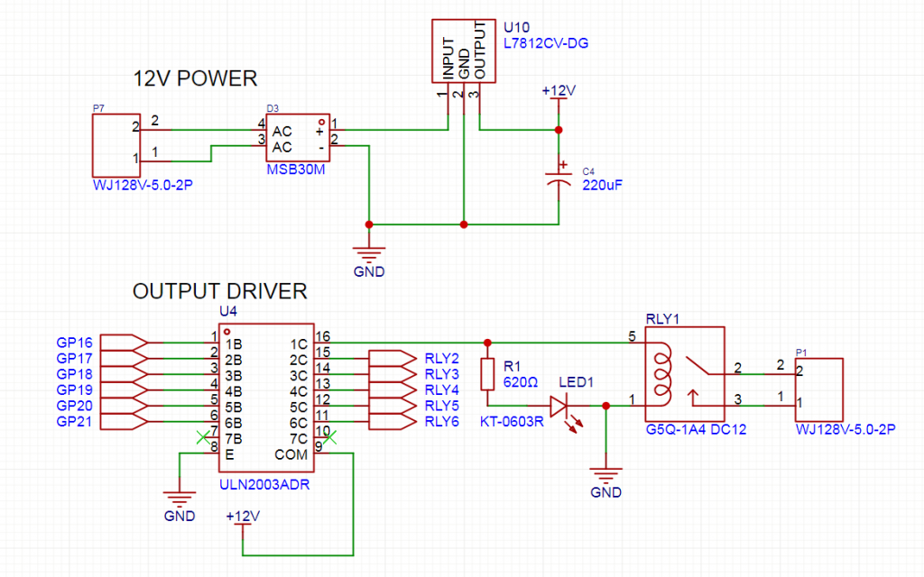 G'day all, I've just got my first order from JLCPCB (great service, top-notch assembly; I'm very impressed!) for my 6-channel GP Controller. A simple idea- Webmite controls 6 outputs, depending on the time settings sent through a web browser. After checking all the relevent volts from the (2x) USB connection and the rectified AC supply, I soldered in the Webmite to do some further tests. All good until I fired up the AC supply and found that the 7805 reg is getting pretty hot, plus no output is actually changing state on the ULN output. The input is changing state as expected, but not on the output drivers for the relays. Here's the (cut-down) schematic... ![]() The AC comes in, gets rectified and regulated to 12VDC. That's supplied to the ULN2003 which SHOULD drive the relays accordingly (along with an LED to show the status) For some reason, the reg heats up; the LED's don't change state; nor does the relays. There's no shorts that I can find on the PCB, so I'm pretty sure the PCB is correct. Removing the relays makes no change. Do any of the hardware wizards spot whatever the dumb mistake is that I've done? It's got me a bit baffled and I'm now in head-scratch mode....... (PS: RLY2 to RLY6 is just a repeat of the RLY1 circuit) Edited 2024-12-04 16:18 by Malibu John |