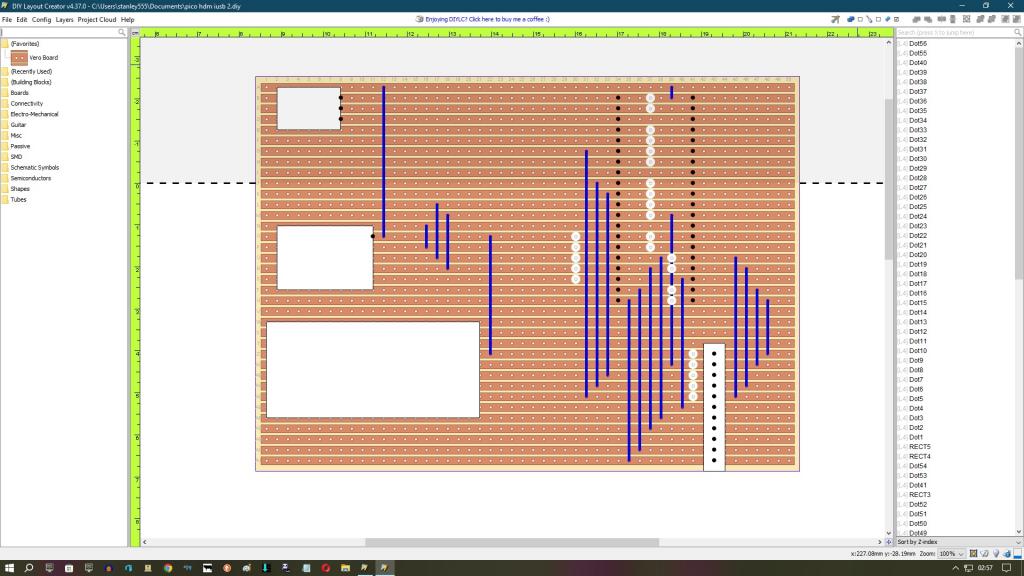 vero is not popular... pcb is. if the boards wee "easy" like ebay then cool but seems quicker to build a board. problems with capacitance,er? this was a Sunday after noon project,beat getting pissed. the ver could be smaller the diy circuit layout can move links or anything on screen, new to me but interesting. other features not used yet I may make it smaller with smaller sd and usb to ttl but same size board as vga board. I had this on bread board before :) |