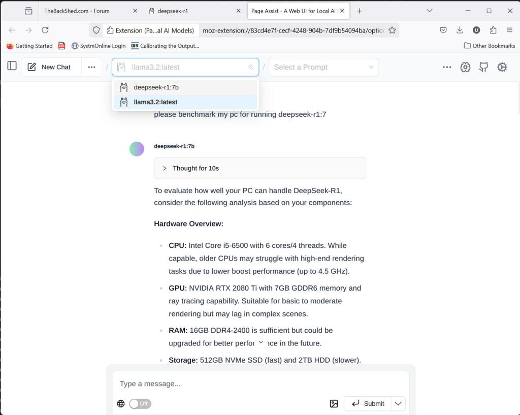 Firefox , and I assume other browsers, has an extension "page assist" that provides a lightweight GUI interface to Ollama and through it to your local Deepseek model. Using the page assist extension you can quickly swap between different models using  a dropdown on the page.