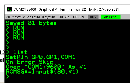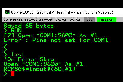 @Grogs I understand your thought process. I have been porting over this code from an ARMITE F4 on which the code works but without the ON Error Skip and OPEN "COM1:9600" as #1. (As I open the port early in the program)