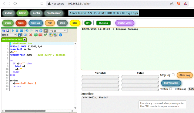 The code contains a little kluge so that I could use the "Immediate" window to enter the html to be displayed instead of the serial connection, but it should work as is through serial.