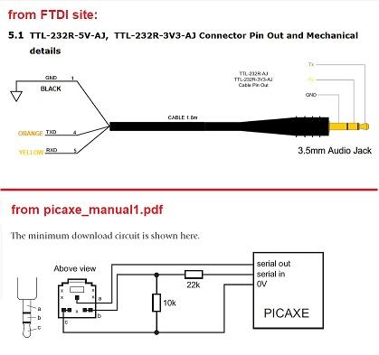 I checked the code TTL-232R-5V-AJ and it's a standard FTDI usb to TTL cable sold by a lot of companies. The FTDI datasheet shows the 3.5mm plug as tip is Tx ring is Rx and sleeve is GND (0v) But the AXE027 is wired differently: tip is 0V ring is Tx sleeve is Rx ![]() Maybe that's the issue. regards Peter |