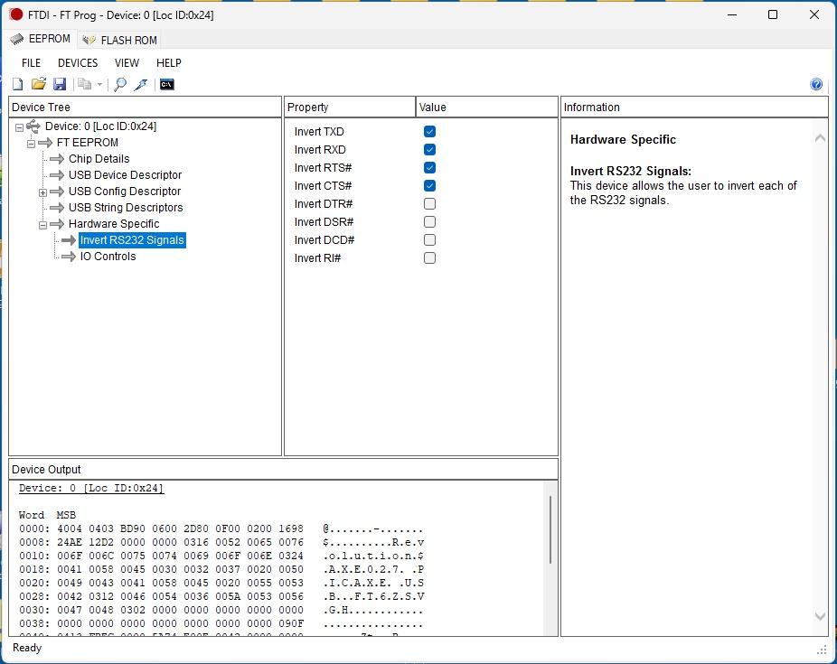 If it's using a proper FT232R IC inside the USB plug then there is a way to invert the Tx,Rx logic. FTDI have a utility called FT_PROG which allows anyone to reprogram the IC's internal EEPROM. One of the parameters sets the logic of the signals. I've used the FT232R a lot but the only time I needed to invert the signal logic is when using it with a PICAXE. I haven't looked deeply into it but I don't think the CP21xx or Prolific USB-to-TTL ICs have this option. This is why Revolution Education use the FTDI IC. Here's a screenshot of the setting using a genuine AXE027 & FT_PROG ![]() Forgot to mention, if you do change any settings in the FT232R make sure you unplug and then plug the USB cable back in so it loads the new settings. Edited 2025-09-10 11:46 by ElectroPI |