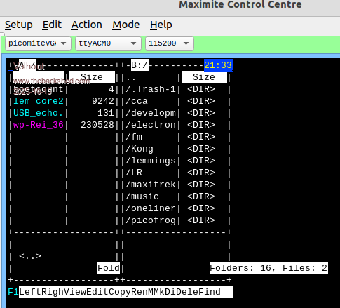 Hello! I spent the last days to get it complete. The changes: - the init routine is complete - the main loop is done - dialogs are rewritten and done - dialogs and everything is centered - dialogs have an option for confirm, "yes to all" and cancel - you can set behavior for confirm and overwrite - Everything scales correctly from 5 x 37 to 100 x 240 characters terminal size - on VGA and HDMI in all Mode 1 resolutions - Took special care for LCD and it should run from ILI9341 320x240 to any. - On LCD you can chose any system font - code cleanup and formatting There are still minor cosmetic issues. Error handling is not done yet I haven't touched the backend subroutines at all. All I can say is that they run super stable and deliver correct answers. Please test this and comment! minifm_RC.zip smallest possible, here 40x20 like on a ILI9341: ![]() Standard 80x24: ![]() 'Custom variables----------------------------------------------------- Dim integer confirm_each = 1 '0:Don't ask, 1:always ask Dim integer overwrite = 0 '0: alwasy ask, 1: don't ask Dim integer run_bas = 0 ' disable Enter to execute .bas file Dim integer lcd_font = 1 ' 0 to use system setting Dim integer tty_console_row = 24 'terminal height, min = 5 max = 100 Dim integer tty_console_col = 80 'terminal width, min = 37 max = 240 Dim integer cursor_colour = 7 Dim integer fn_colour_bc = 7 'F Key colour Dim integer fn_colour_fc = 0 Dim integer clock_bc = 14 Dim integer clock_fc = 3 Dim integer keypress_delay = 20 'in mSec Dim integer DnFColor=0 'Dirs & Files Color (0=Colorer ON) Dim integer SelColor=14 'Color of selected files Dim integer RMAX=199 'Max number of Records in File List (255 max) '--------------------------------------------------------------------- Edited 2025-10-20 00:28 by dddns |