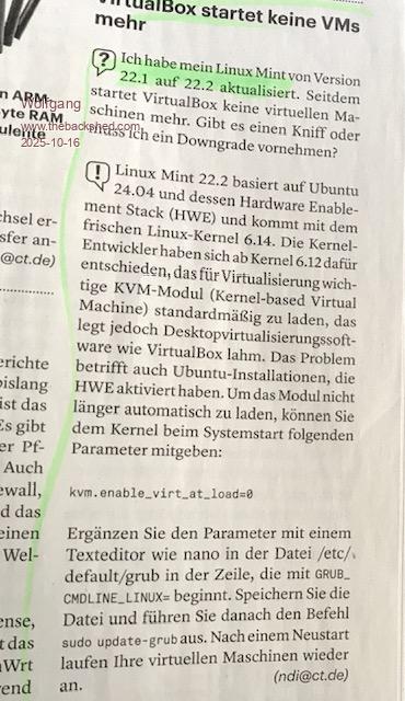 I updated my Linux Mint from version 22.1 to 22.2. Since then, VirtualBox no longer starts virtual machines.