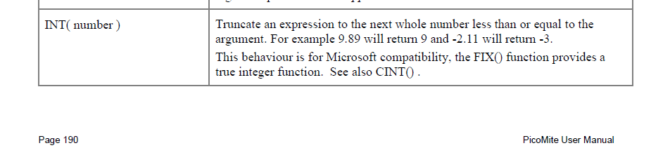 INT has been there since the dawn of time, or at least the birth of MMBasic ![]() Jim VK7JH MMedit |