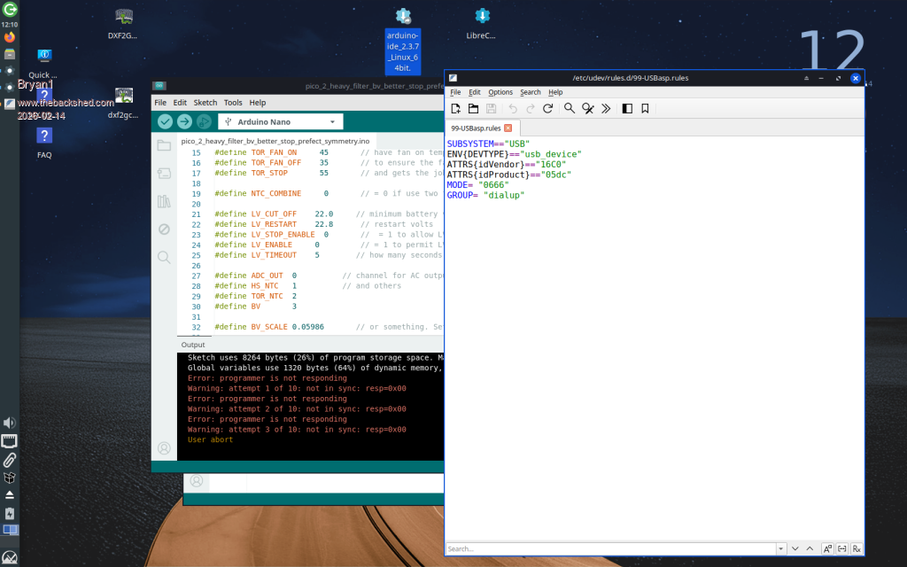 Can you copy this exactly in one line and insert it in the file: The stuff you showed has errors. SUBSYSTEM=="usb", ENV{DEVTYPE}=="usb_device", ATTRS{idVendor}=="16c0", ATTRS{idProduct}=="05dc", MODE="0666", GROUP="dialout" NANO:Inverter V 8.2ks - Linux AvrDude GUI script V4.1 |
