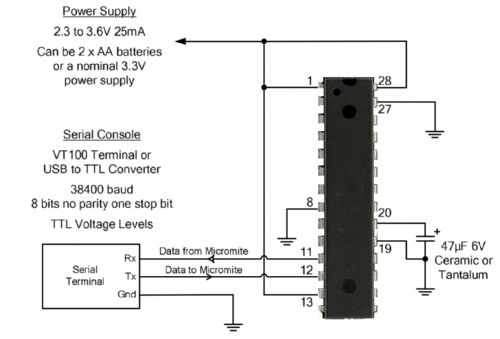 that is a good sign... lets look at the micromite itself again. 4mA strikes me as a little bit low, as if the chip is either un-programmed or being held in reset or some such. have you got it wired up correctly; are you 100% sure? GROUND: pins 8, 19, and 27 Vcc: pins 1, 13, and 28 (pin 1 may be tied to Vcc via a 10k resistor) Is the capacitor connected between ground and pin 20? Pin 20 should ONLY connect to the +ve terminal of the capacitor, and to nothing else. Pin 20 should NEVER be connected to Vcc. i believe you should be able to measure something like 1.8v across the capacitor. if a micromite is functional and programmed correctly, one test is to connect an LED between pins 11 and 13 (longest lead to 13). when power is applied the LED should briefly flicker brightly as the 'signon' message is transmitted by the micromite. all you need is power for this test, no serial connection. rob :-) |
