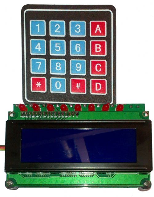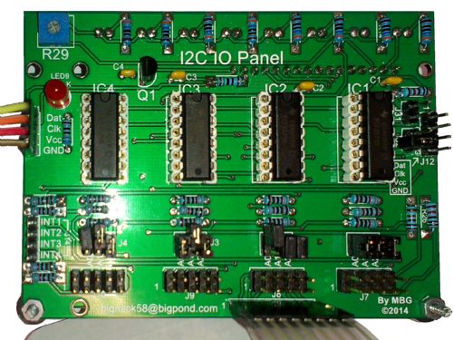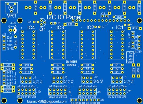 IO-Panel (98mm x 71.5mm) The IO-Panel is driven via I2C (5v power due to the LCD) and utilises 4 individual I2C IO-Expanders, each one can be addressed between 20H and 27H via jumpers. The IO-Panel is designed to mount on the back of either a 20x4 LCD module or 16x4 LCD Module. Channel 1 is the LCD Interface and is pretty self explanatory. Channel 2 is the KeyPad interface and is configured for a 4x4 matrix Channel 3 is to drive a bank of LEDs (8 in total) these are mounted directly above the LCD Module. Channel 4 is unused and is for general use, it goes to a 10pin (dual row of 5 pins) and has all of the IO plus Gnd and 5V. (Actually this header is also provided for the other 3 channels as the user may not wish to use a keypad or LCD or the LEDs etc.)