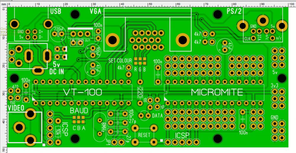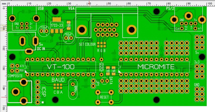 I've been playing around tonight with Sprint Layout: - VT100 and Micromite in standard DIL format for easy chip swapping if need be. - On-board sockets for VGA, Keyboard, USB, DC in, and composite video output. - On-board 3v3 regulator. Diode-gated USB or DC in power supply for the 5v. - Three strips of header sockets for breadboard jumper wires, small point-to-point circuits or a plug-in daughter-board. - 5v, 3v3 and ground headers for powering external hookups. - Baud-rate blob-pads for setting VT100 speed, and blob-pads for selecting VGA colour.