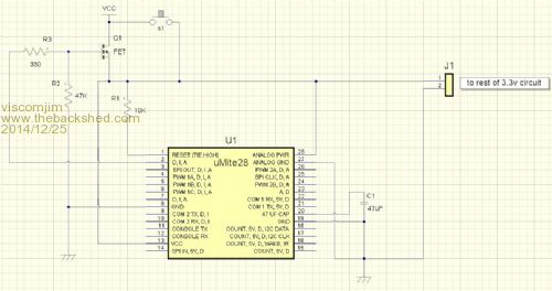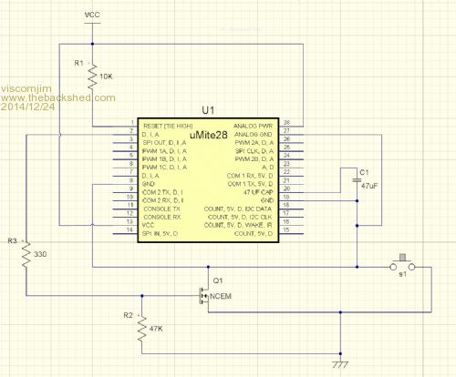 On this same approach of using a mosfet to power the circuit once a switch is pushed to "start" the circuit and then the uMite turns itself off basically, has anyone had any good experiences with the "logic level" fets that work on 3.3v instead of the 5v. There doesn't seem to be many options when it comes to a 3.3v logic level fet that I can find anyway. Any ideas or experiences? EDIT... This is what I'm thinking... The switch get pressed and the uMite gets powered on at which time the uMite turns on the mosfet and keeps it on until it is done doing it's thing and then turns it off. I am switching the ground, and am not sure if this is ok. The second thing is that the mosfet needs to be able to switch about 1 amp max which is why I am not using just a little transistor. The rest of the circuit is not shown, but there will be just a bit of current draw when the mosfet is on. The mosfet right now is the irfz44n or this one. EDIT2... I guess I could also switch the high side also using a small relay quite easily, but solid state is cooler... I haven't found any p channel mosfets that work with 3.3v. |
