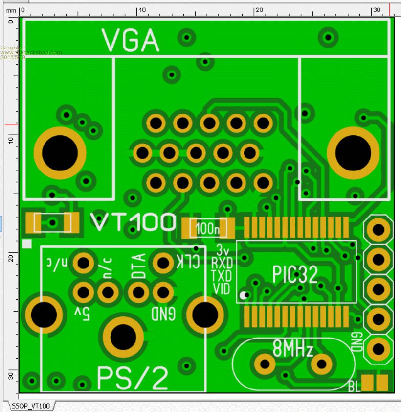 I did not really NEED a VT100 this small, it was just an excuse for me to play with multi-layer. And Shenzhen's PCB prices are just too good for me to not have a play with multi-layer - US$22.90 for ten of these four-layer boards. Having set the PCB size, the mission was "Can I squeeze it all in there?" You would have no hope of doing this module, this small, without going multilayer, I would think.(prove me wrong though!) The PCB size came about based on the VGA socket footprint. It was 31mm wide, so add 1mm and make it square - that was how I came up with the 32mm square size. Smoke makes things work. When the smoke gets out, it stops! |