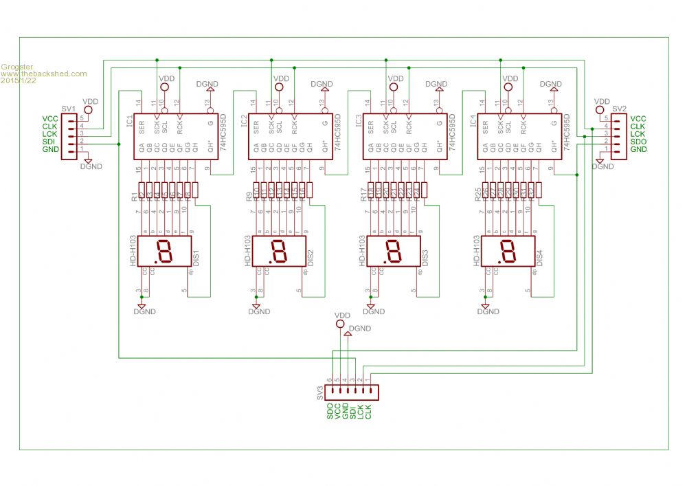 We can assume that there are 4 chips to drive the 4 displays. These will be daisy-chained together.