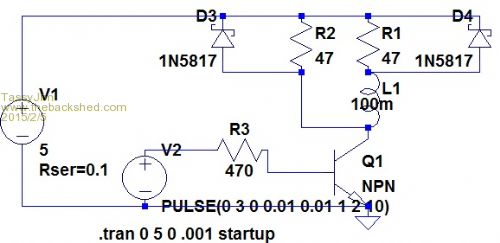 Regards Gerry redrok Good morning redrok, I don't know why you wrote "Not quite" Gerry was right as the resistors are in parallel with the coil as far as the back EMF is concerned, i.e. 47 + 47 = 94 Ohm, thus the 94 Ohm is in parallel with the coil & the coil current decays through them. Larny |