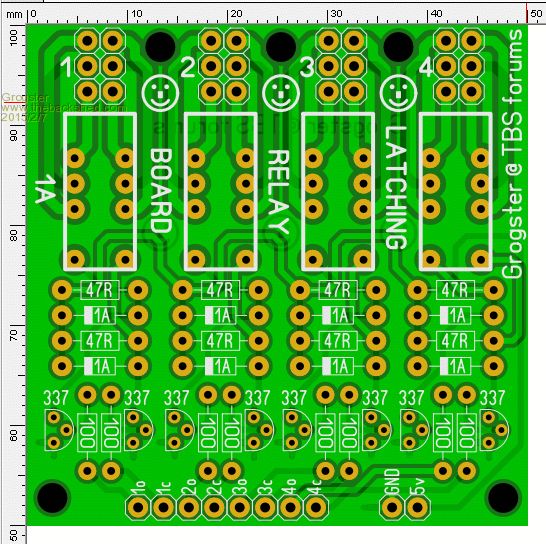 Here is my latching relay PCB. Lets you control up to four sperate DPDT latching relays on the one board. Full transistor driving on-board, and all relay contacts brought out to pin headers. 50 x 50 PCB size, so nice and small-ish. Each relay can handle up to 2A @ 30v DC per pole. PLEASE NOTE THAT THIS BOARD IS NOT DESIGNED FOR, NOR SHOULD IT EVER BE USED TO SWITCH MAINS VOLTAGE. I would hope that members here would know that, but I feel I should point that out, before someone makes the attempt. If you need to switch more then 2A, you can use the latching relay, to switch other more powerful relays - that is actually how I have one of the prototype latching relay circuits setup. I will be getting some of these made next week(as 2x2 panels), so if anyone is interested, flick me a PM. All standard through-hole parts(easy to build!), and you can buy the Panasonic relays from eBay - US12.95 for ten relays. Being that these relays are made by Panasonic, they should not be hard to find elsewhere if eBay run out. RELAY LINK There is a link to the PDF for these relays, on the eBay link if you follow that. These relays are actually 4.5v coil, designed specifically for being driven by a transistor and 5v supply. TOP COPPER: