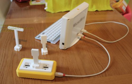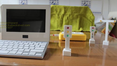 The yellow box shown above contains the actual MicroMite (28-pin MX170 in this case) and collectively form the kids computer. The yellow box in this setup is referred to as the 'I/O Box'. Into this are plugged various educational 'Modules' - here you can see the set of three 'Road Sign' Modules.