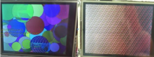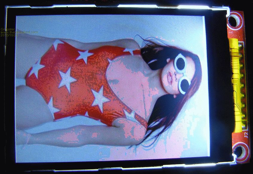 Sorry this image is not the best - neither is my camera. Note the pink discolouration around the face and lower neck. Not sure if this is what you are seeing or not. Also, the orange on the swimsuit is pixelated in two shades of orange - light and dark orange. This SPI LCD is fine with text and graphics. Smoke makes things work. When the smoke gets out, it stops! |