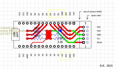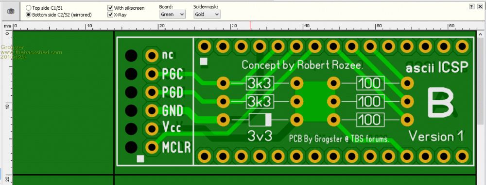Using Shenzshen-2-U PCB service, 100 of these little boards can be had for US$11.90, so 11.9c each. Bundled with a Arduino Nano from eBay and the extra resistors and zener, I expect the final kit price to be about US$7 + P&P, so about US$10 roughly, for full kit including Robert's PCB, the Nano board, all extra parts and airmail postage to anywhere on the planet. This is only about one third the cost of a standard PICkit3 clone.