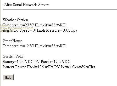 Member MikeO interfaced the uMite with the ESP8266 running the basic port from MMISCOOL. Here is what he said in a different thread. I hope no one minds that I started a new thread for this as it is a great start to getting these two units to talk to each other... MikeO said... Hi Jim, I have just posted some code on ESP Basic today for interfacing with a uMite, transfers 10 data fields and commands, currently sends emails , reads NTP time and requests setup info from ESP8266, I had some sync issues trying to send all the data individually probably due to the limited control you have with the ESPs INPUT command as it's blocking and will wait for ever if you have any data screw ups but in the end I used a single string and built a parse routine on the ESP to pull out the fields, which seems to be quite robust. Have a look may help you with your quest! umite to ESP8266 I hope MikoO will post the code he is using on the uMite side for this. Extremely exciting stuff. uMite interface to the www! |