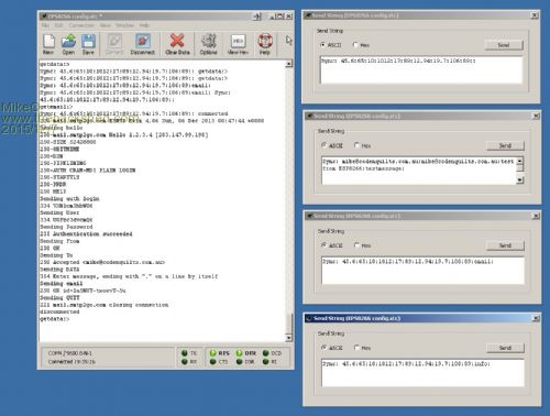 If you get this then all is good! You should then see every 6 secs the following, as the software polls the serial port via the input "getdata" command. Due to the new "Serialtimeout" command it is just terminating looking for an input after the period set in the serialtimeout command in this case 3 secs. LineLen:0 Packet: Command: getdata:> LineLen:0 Packet: Command: getdata:> LineLen:0 Packet: Command: getdata:> Now you can start sending data and commands via the terminal program. On a new line type info:crlf and the response from the ESP8266 will be, Command: getdata:> info: info: LineLen:6 Packet:info: info Command:info Version:ESP8266 uMite SNS WUI 0.6b IP:192.168.0.102 SSID:TP-LINK_C95080 FlashFree:357675 RamFree:7200 likewise if you type ntp:crlf Command: ntp: getdata:> ntp: LineLen:5 Packet:ntp: ntp Command:ntp NTP:Thu Dec 10 13:47:49 2015 To send an email (provided you have to set up the emailsetup command in the program). type... email:crlf sync: mike@codenquilts.com.au:mike@codenquilts.com.au:test from ESP8266:test:crlf and the response will be something like this. email: LineLen:7 Packet:email: email Command:email getemail:> sync: mike@codenquilts.com.au:mike@codenquilts.com.au:test from ESP8266:test: Send to:mike@codenquilts.com.au connected 220 mail.smtp2go.com ESMTP Exim 4.86 Thu, 10 Dec 2015 02:57:05 +0000 Sending hello 250-mail.smtp2go.com Hello 1.2.3.4 [203.147.99.198] 250-SIZE 52428800 250-8BITMIME 250-DSN 250-PIPELINING 250-AUTH CRAM-MD5 PLAIN LOGIN 250-STARTTLS 250-PRDR 250 HELP Sending auth login 334 VXNlcm5hbWU6 Sending User 334 UGFzc3dvcmQ6 Sending Password 235 Authentication succeeded Sending From 250 OK Sending To 250 Accepted <mike@codenquilts.com.au> Sending DATA 354 Enter message, ending with "." on a line by itself Sending email 250 OK id=1a6rPr-kaUEES-9u Sending QUIT If you follow this you should get the idea how to use the ESP program when connected to a Mite! Let me know how you go on. Cheers Mike. Codenquilts |